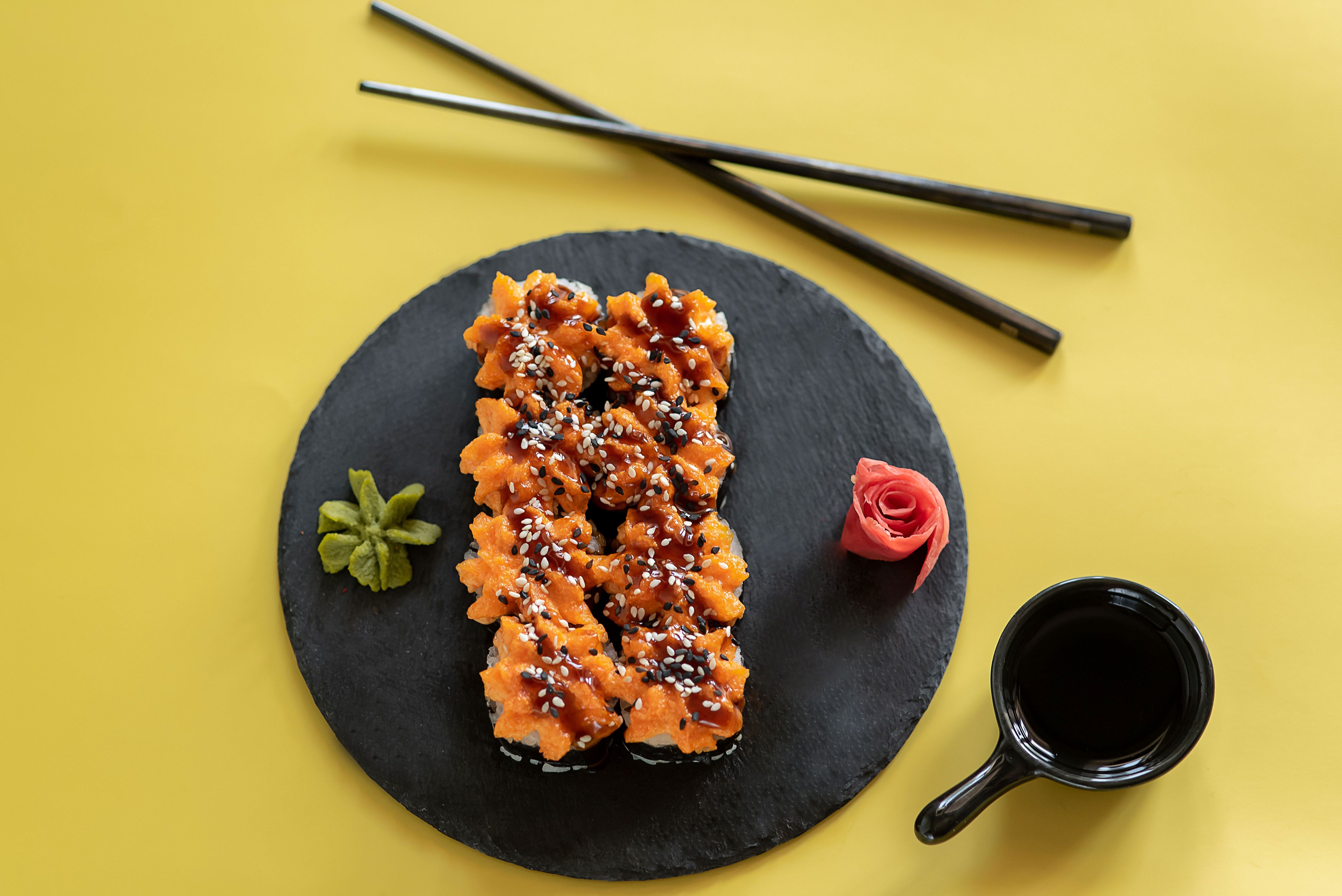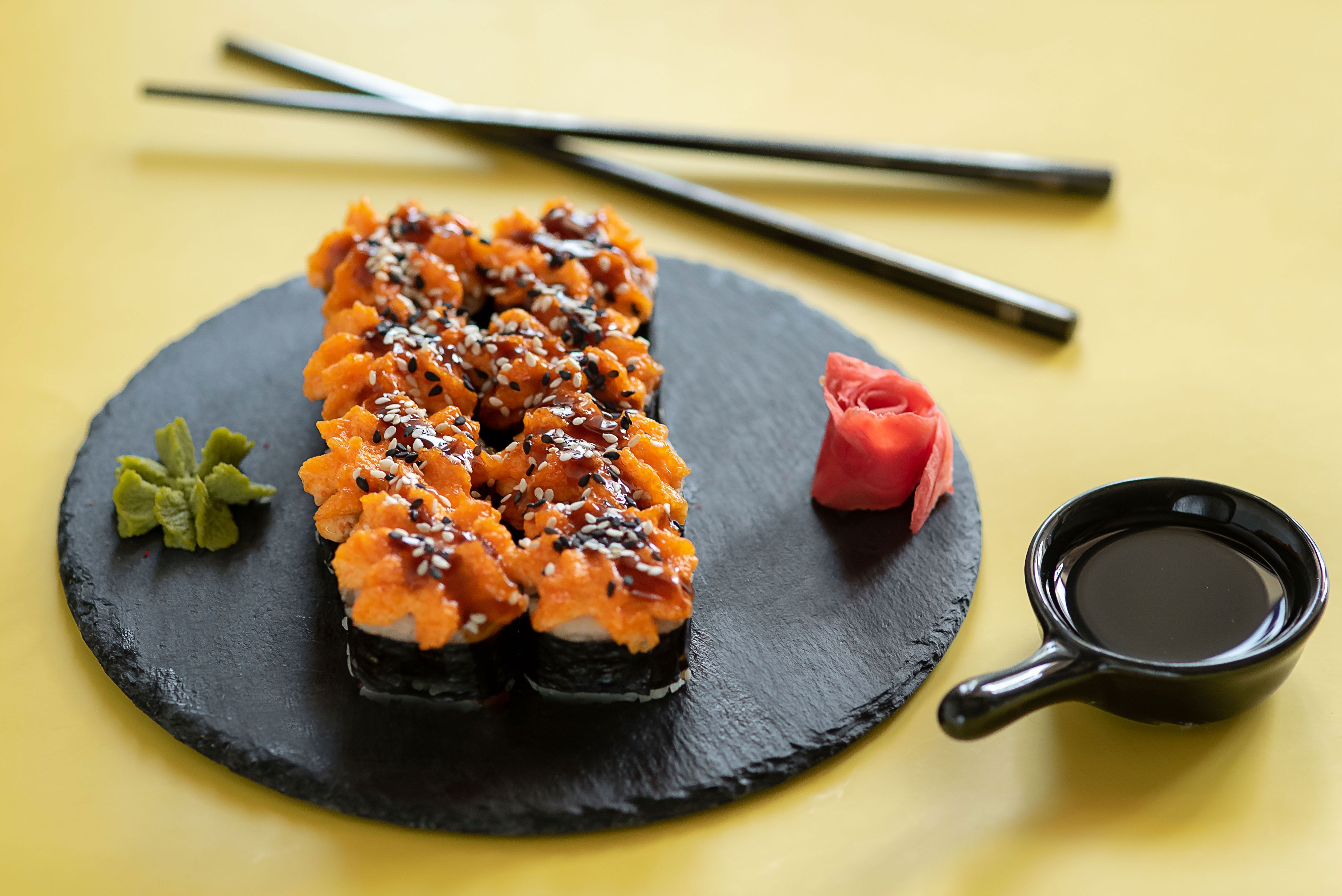 Рис, нори, начинка на выбор, огурец, сливочный сыр, масаго-соус, унаги-соус, кунжут.