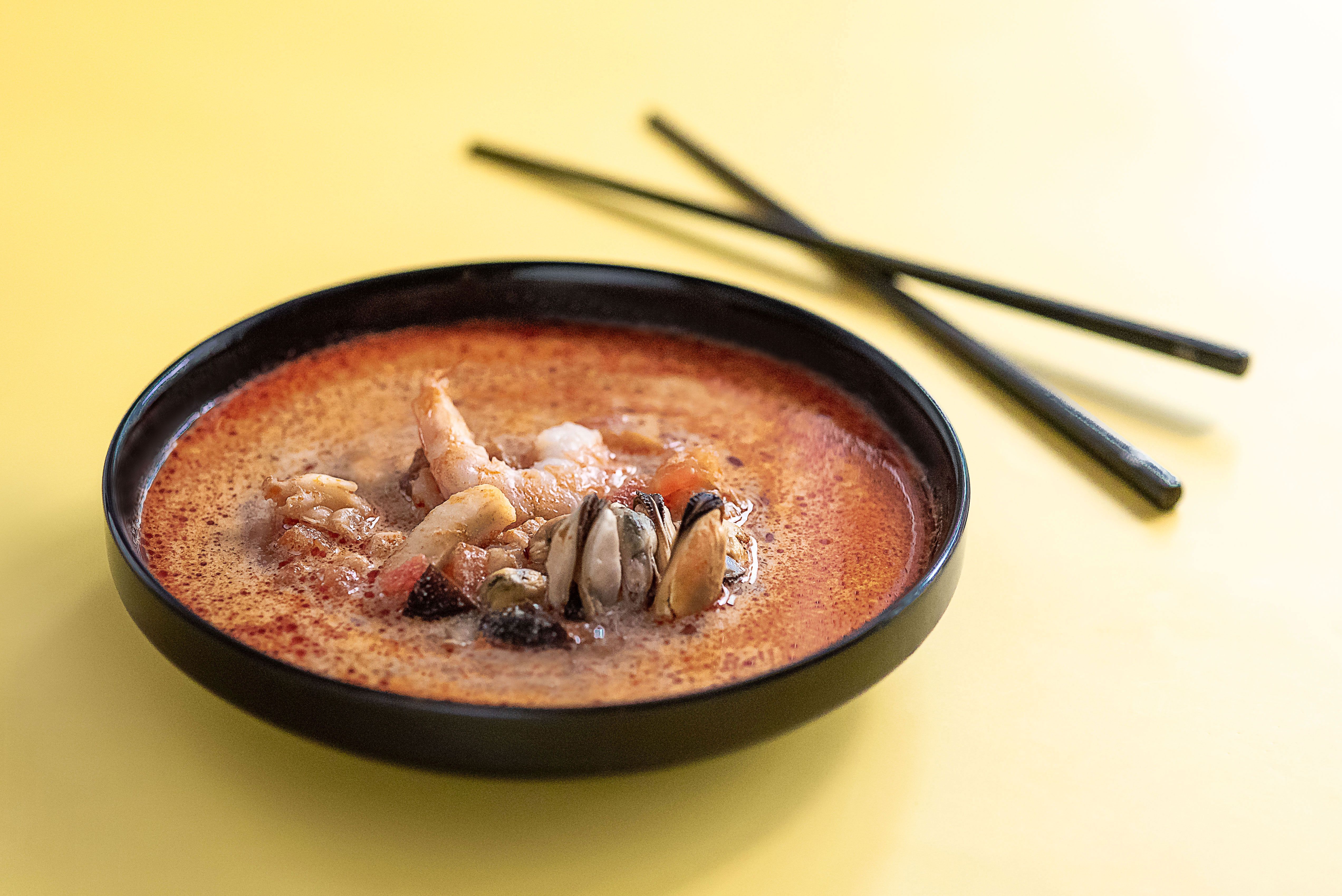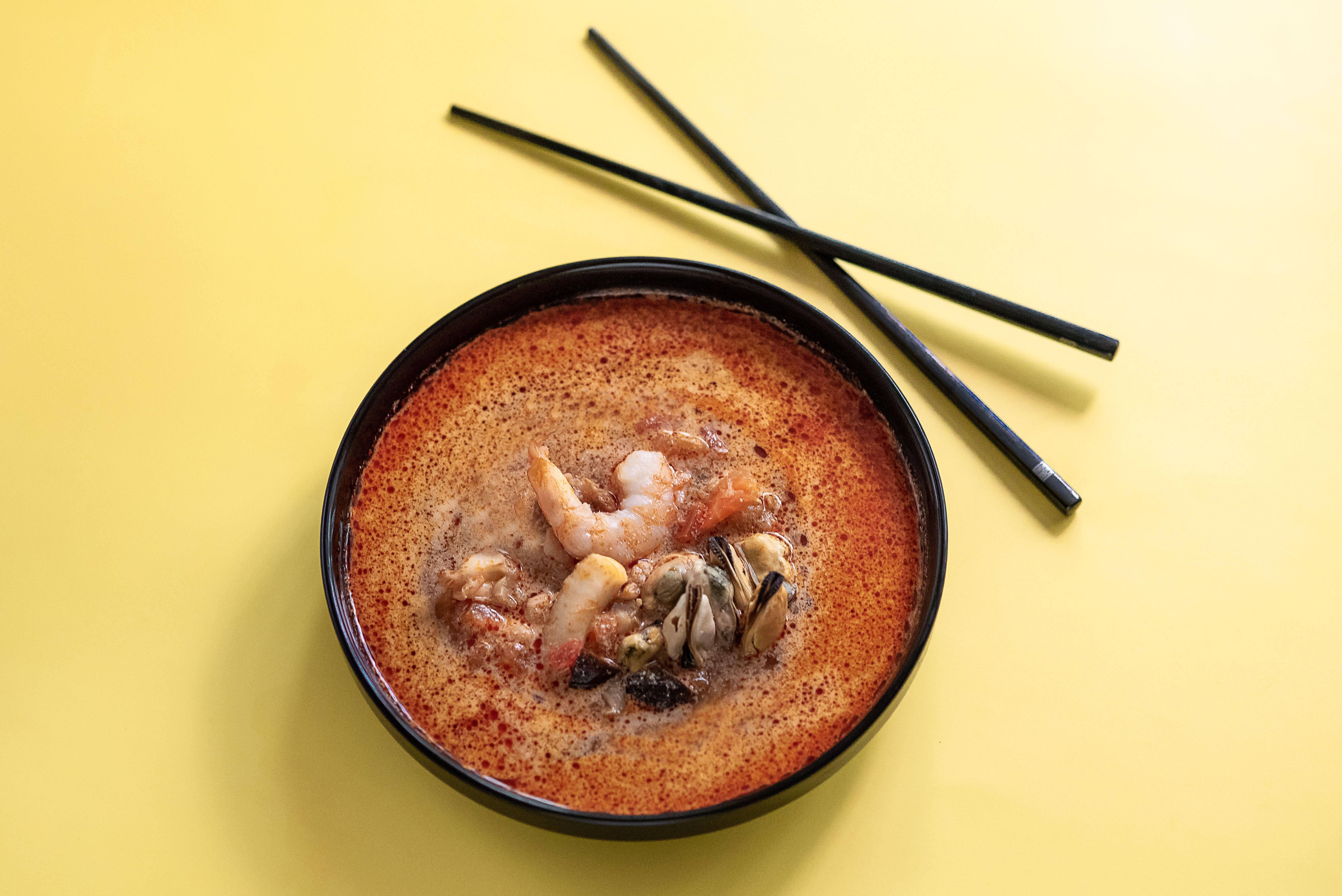 Сливки, морской коктейль (кальмар, мидии, осьминог), тигровые креветки, лук репчатый, грибы шиитаке, помидоры, паста том ям, имбирь, зелень.