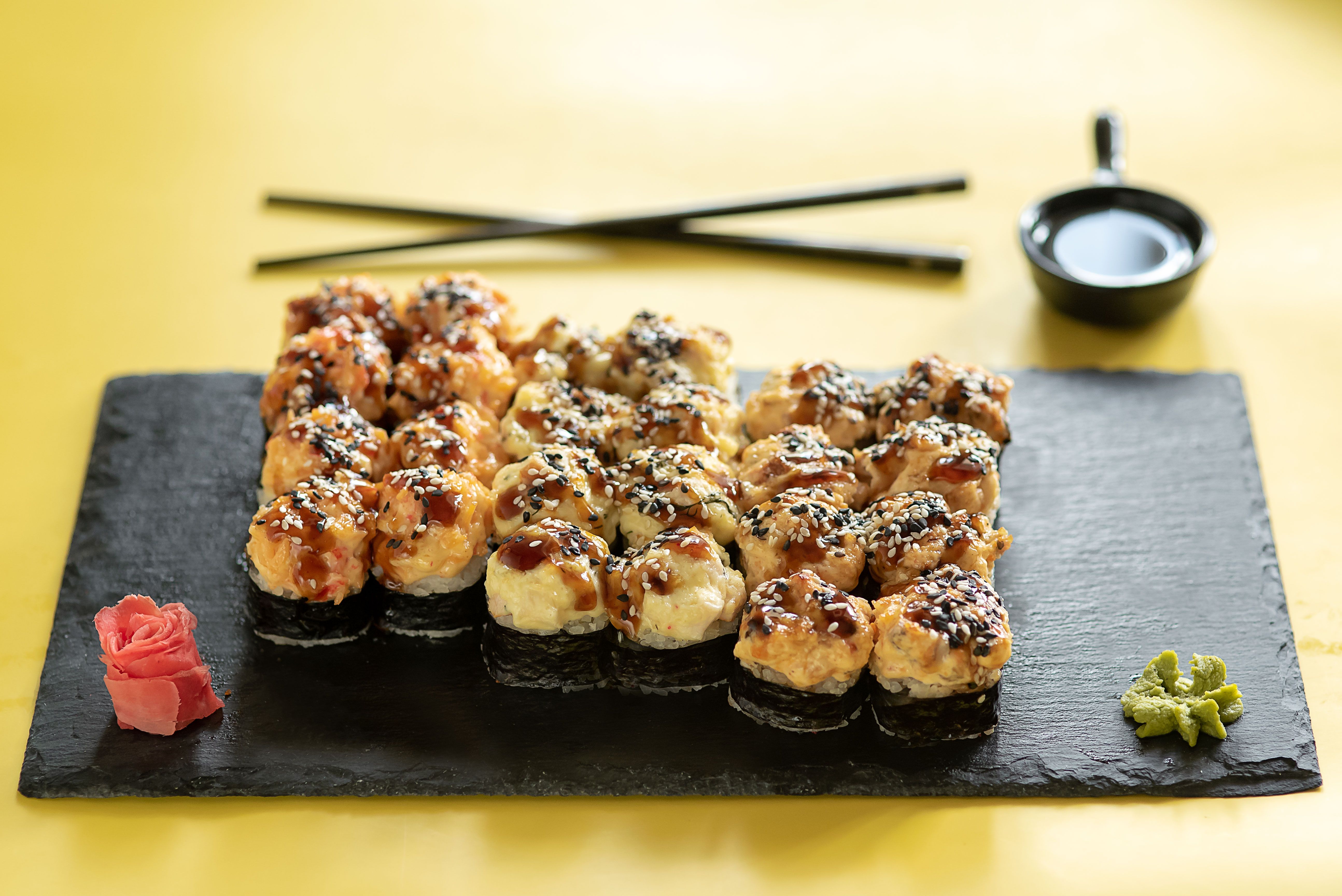 Соевый соус, васаби и имбирь не входят в блюдо и заказываются отдельно :)