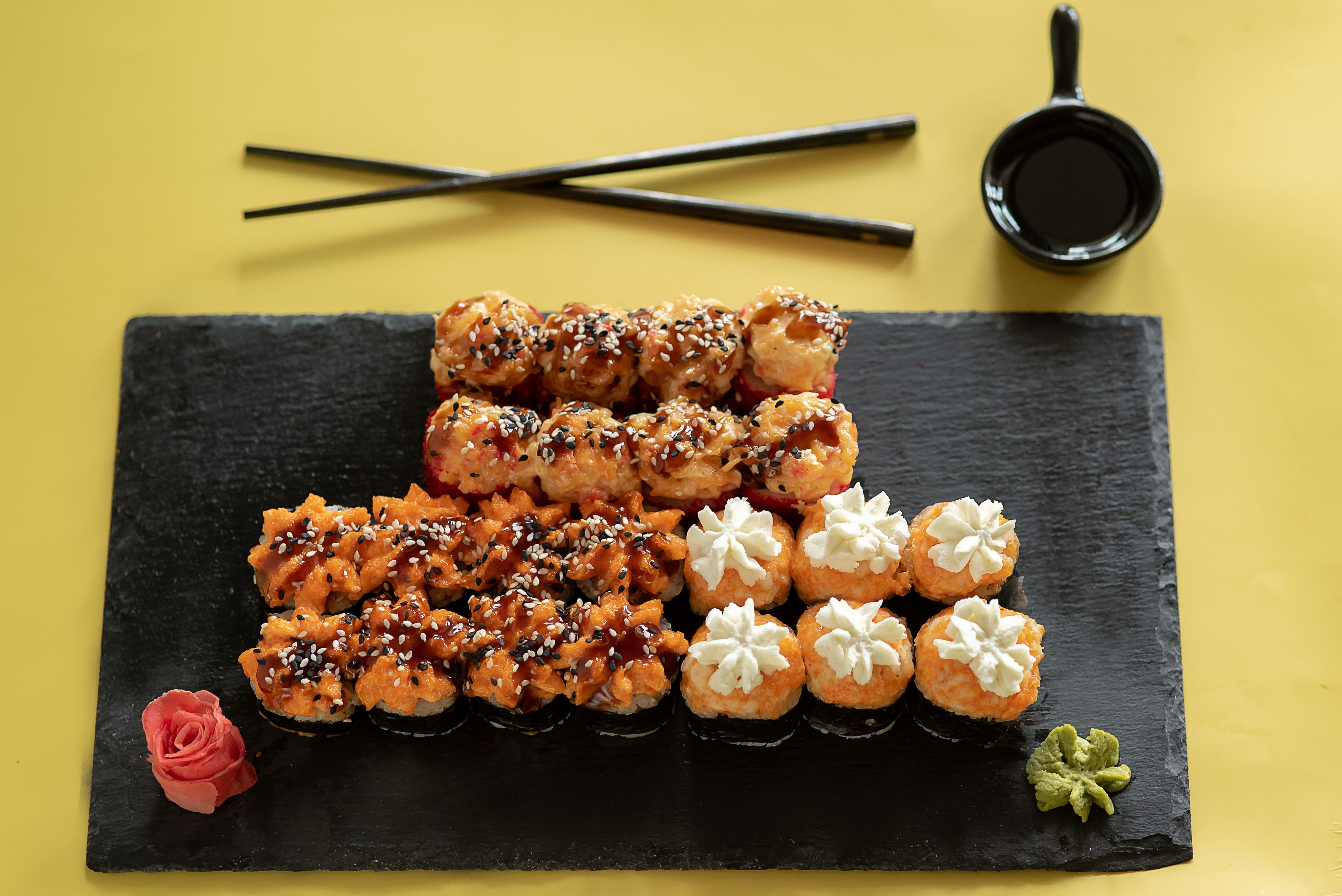 Соевый соус, васаби и имбирь не входят в блюдо и заказываются отдельно :)