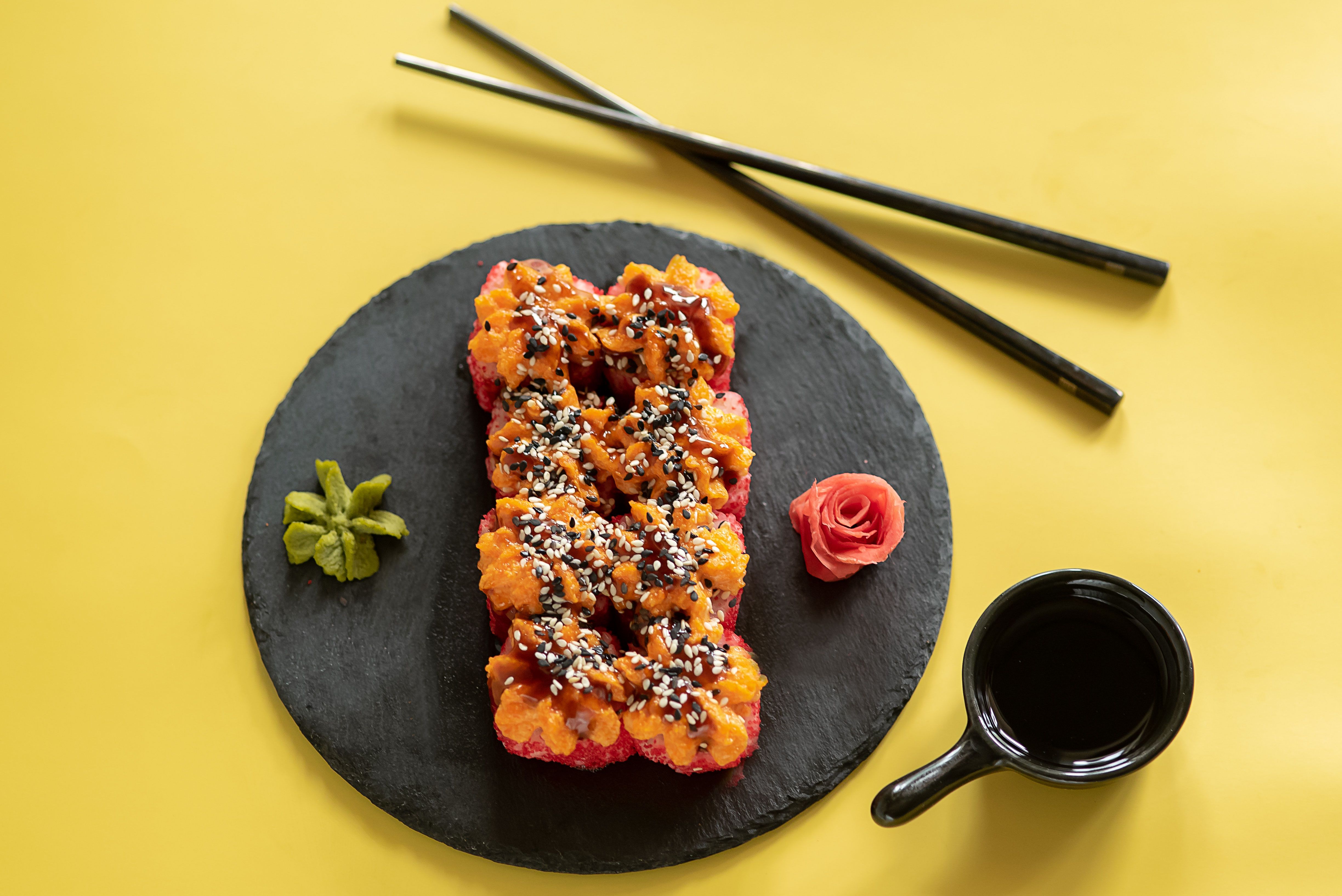 Рис, нори, снежный краб, огурец, масаго-соус, икра масаго, унаги-соус, кунжут.