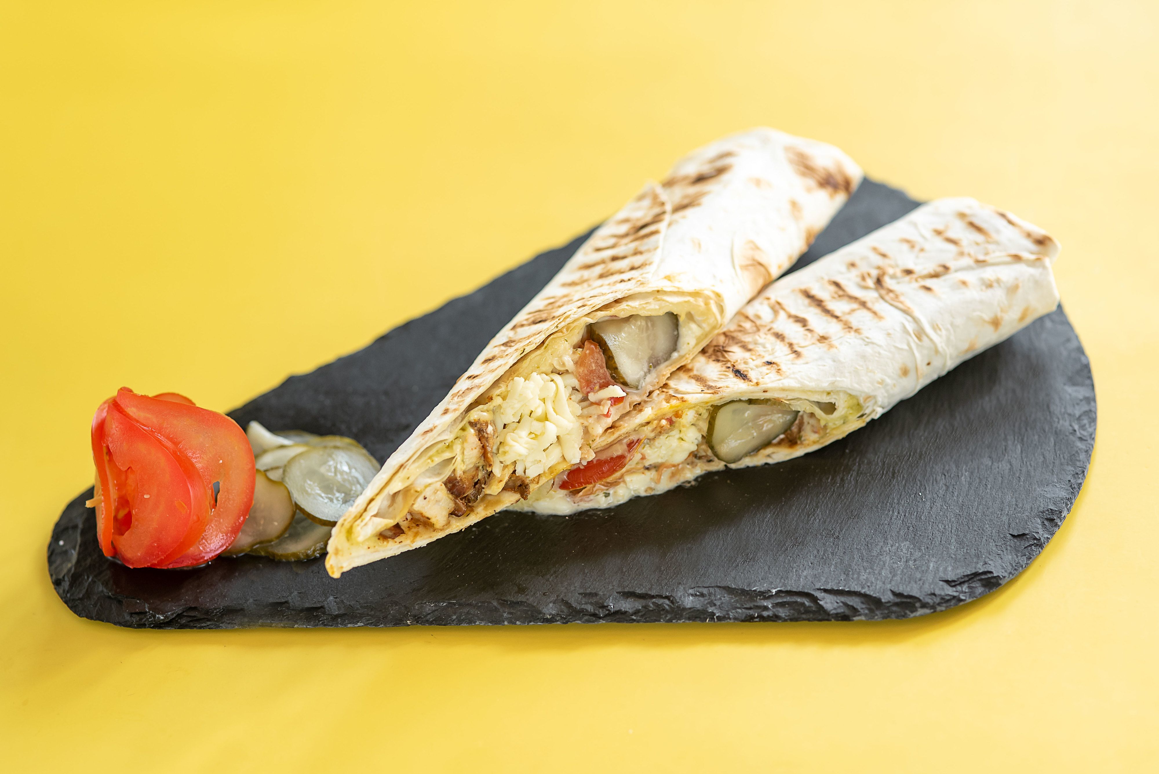 Сочное куриное филе со свежими помидорами, маринованными огурцами и маринованной капустой, твердым сыром, приправленные фирменным чесночным соусом с укропом и сырным соусом, обернутые в поджаренный на гриле лаваш