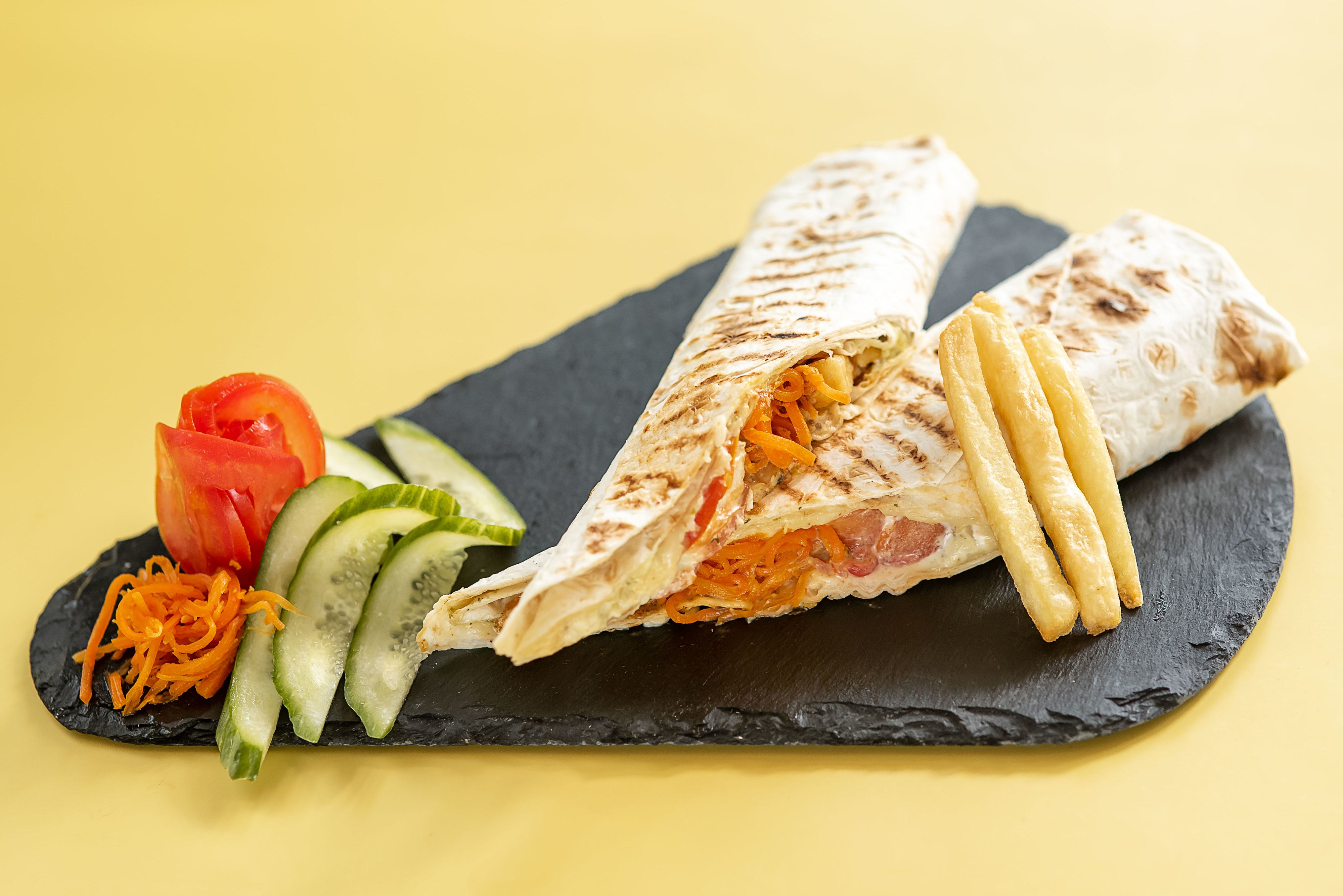 Сочная маринованная капуста с помидорами, свежим огурцом, морковью по-корейски, картофелем фри, приправленные фирменным чесночным соусом с укропом, обернутые в поджаренный на гриле лаваш